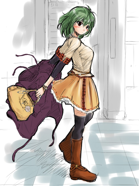 tonpuu, fujisawa yayoi, fujisawa yayoi (uchuu no stellvia), anna miller, uchuu no stellvia, 00s, 1girl, breasts, character name, checkered background, donut hair bun, female focus, hair bun, huge breasts, orange skirt, skirt, solo, waitress