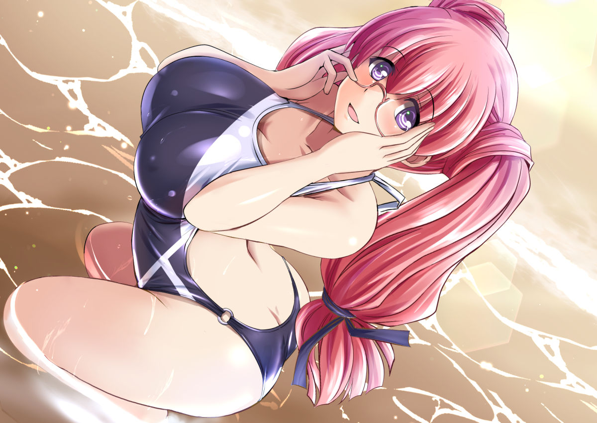 :d1girlbare armsbeachbikiniblack one-piece swimsuitblushbreastsbutt crackcleavagecollarbonecompetition swimsuitcovered erect nipplesdayglasseshair ribbonlarge breastslong hairlooking at viewero-ringoceanone-piece swimsuitopen mouthoutdoorspink hairpurple eyesribbonside-tie bikini bottomsmilesolosquattingswimsuitvery long hair