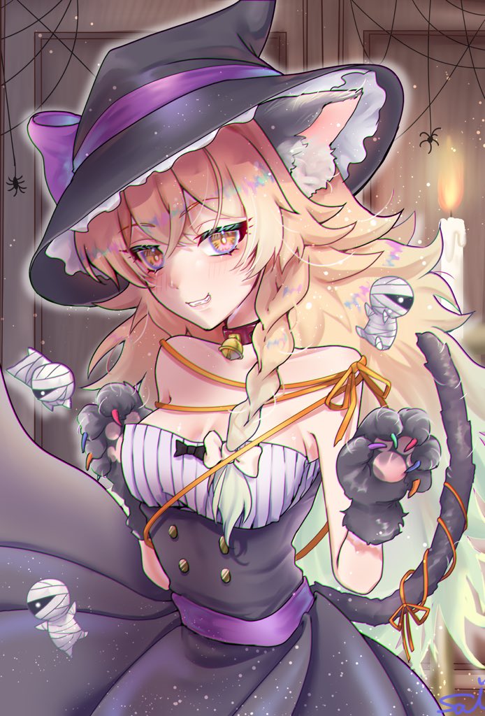 animal earsblack dressblonde hairbraidcat earsdresshalloween costumehatpurple ribbonribbonsilkspider webwitch hat