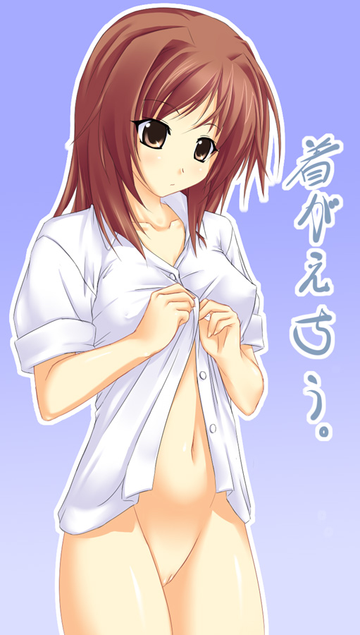 highres, 1girl, breasts, female focus, glasses, nipples, no panties, open clothes, open shirt, pussy, shirt, short hair, solo