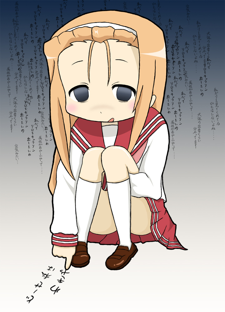 00s1girlempty eyesfemale focusfull bodygradient backgroundhairbandlong hairorange hairschool uniformserafukushoessittingsockssolotext focuswriting