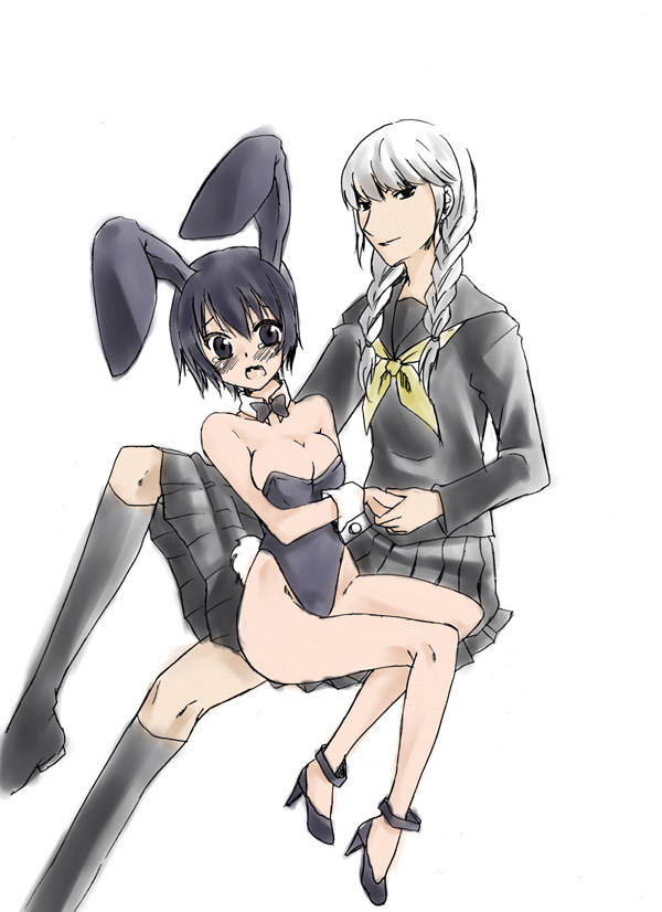1boy1girlanimal earsbare legscrossdressingfake animal earshigh heelsplayboy bunnyrabbit earsschool uniformserafukushoes