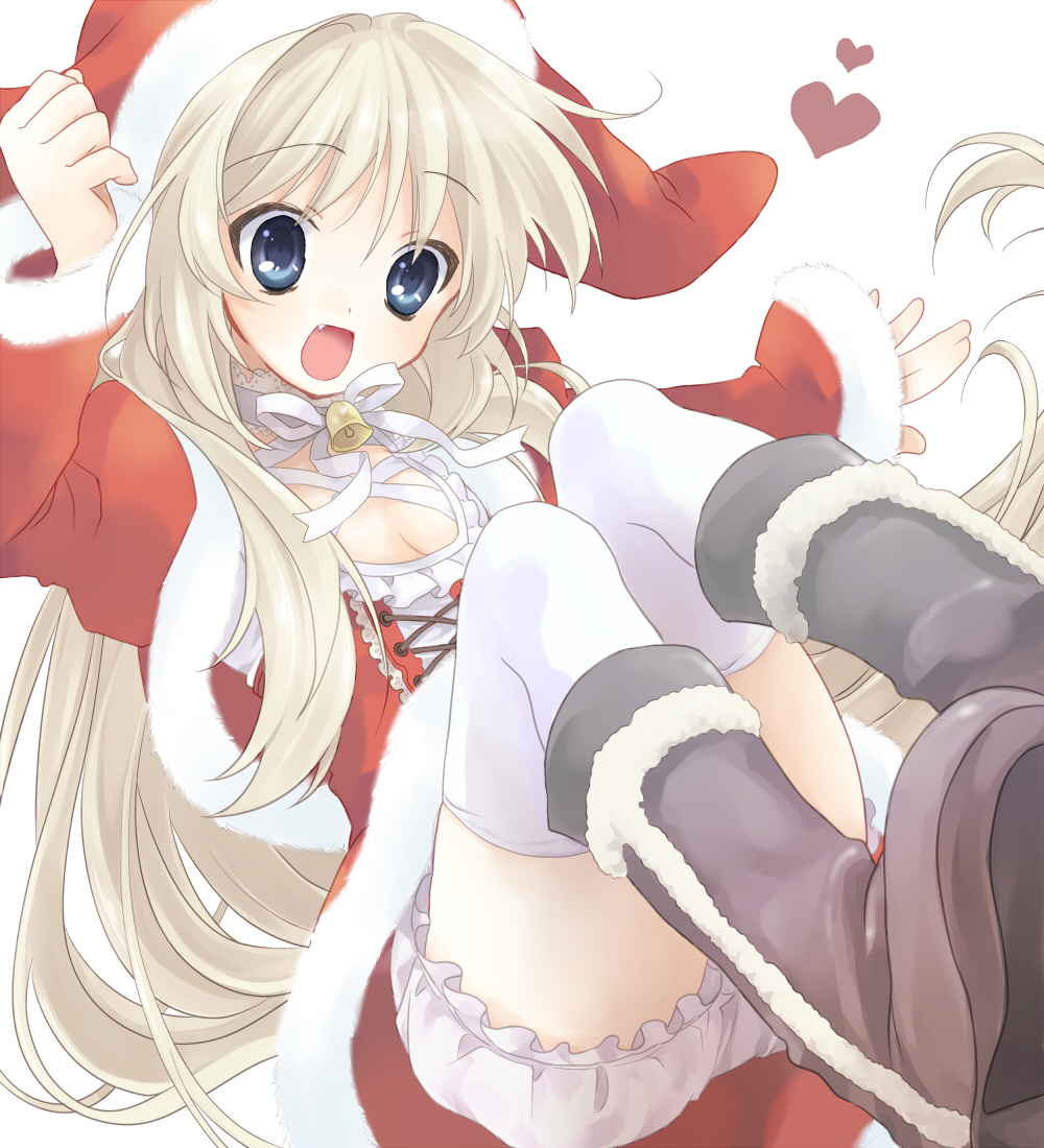 1girlblonde hairbloomersblue eyesbootschristmasfangfemale focusflat chestfur bootshatheartlong hairsanta costumesanta hatsolothighhighsunderwearwhite bloomerswhite thighhighs