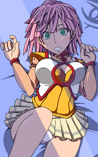 gunner-l, nei, phantasy star, phantasy star ii, sega, 1girl, alternate breast size (larger), ass, bare shoulders, bent over, blush, breasts, claws, covered erect nipples, elf, female focus, gradient background, huge breasts, leotard, long hair, looking back, orange background, pink background, pointy ears, purple hair, purple leotard, purple thighhighs, red eyes, solo, thighhighs, weapon, wedgie