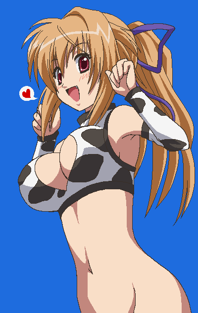 :d1girlanimal printarmpitsblonde hairblushbottomlessbreastscleavagecleavage cutoutclothing cutoutcow printdetached sleevesfemale focushair ribbonhappyjaggy lineslarge breastslong hairno pantiesoekakiopen mouthponytailpurple eyesribbonsmilesolo