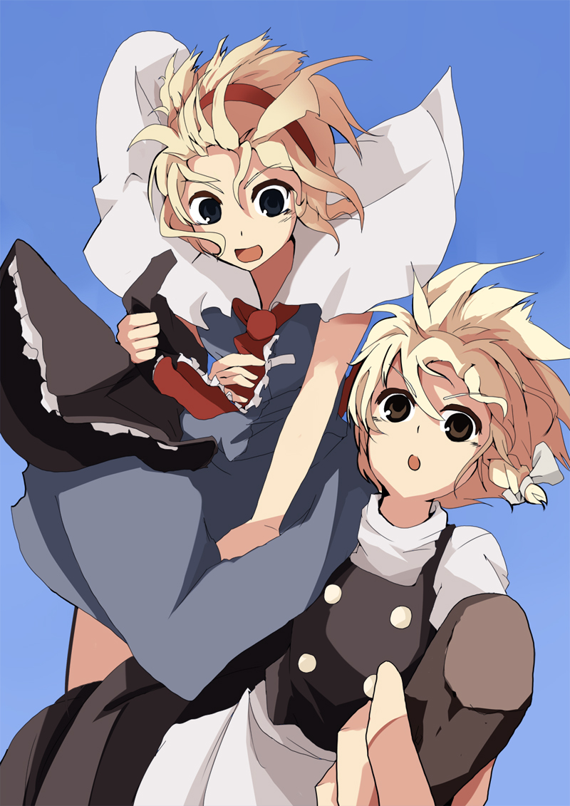 2girlsblack eyesblonde hairbroombroom ridingbrown eyesfemale focusflyingforeheadhairbandhatholdingholding unworn clothesholding unworn hatmultiple girlsribbonshort hairsimple backgroundskyunworn hatunworn headwearwind