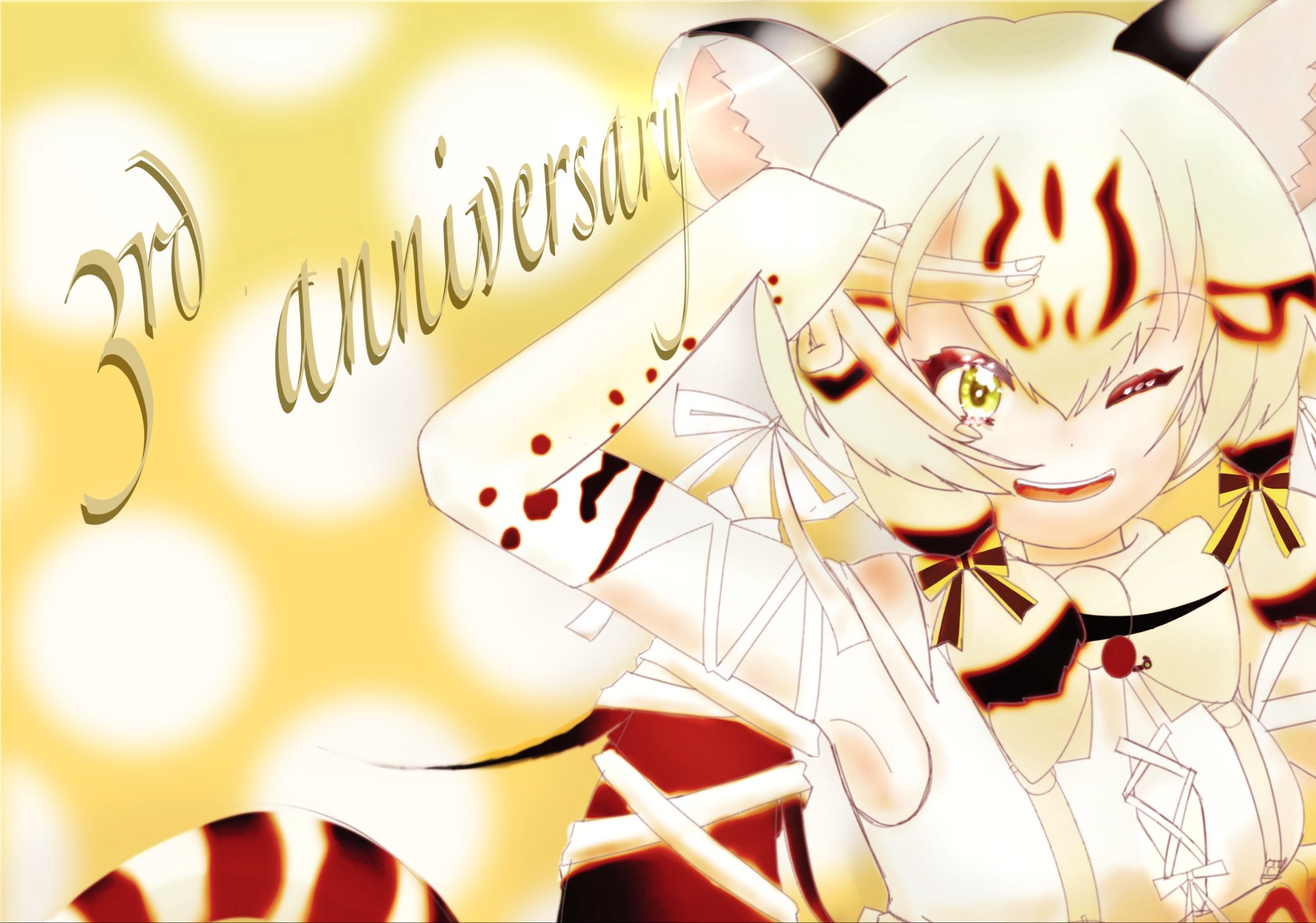nia aragi, geoffroy's cat (kemono friends), kemono friends, kemono friends v project, highres, 1girl, animal ears, anniversary, arm up, bow, bowtie, cat ears, cat girl, cat tail, extra ears, grey hair, long hair, looking at viewer, microphone, one eye closed, ribbon, shirt, simple background, solo, suspenders, tail, twintails, upper body, v, virtual youtuber, yellow background, yellow eyes