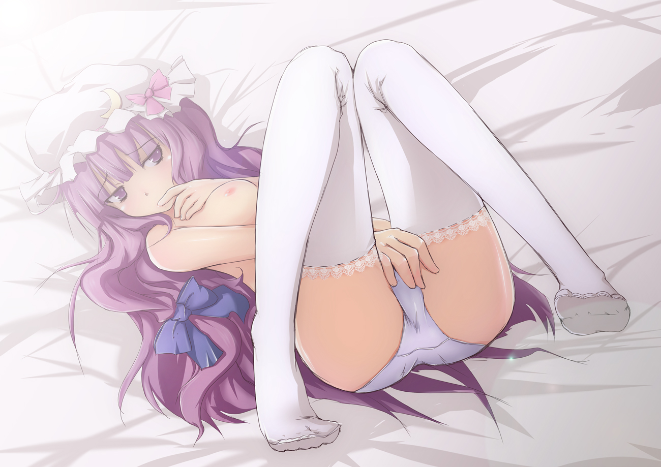 1girlbreastsfeetfemale focuslong hairlyingmedium breastsnipplesno brapantiespurple eyespurple hairsolothighhighsunderwear