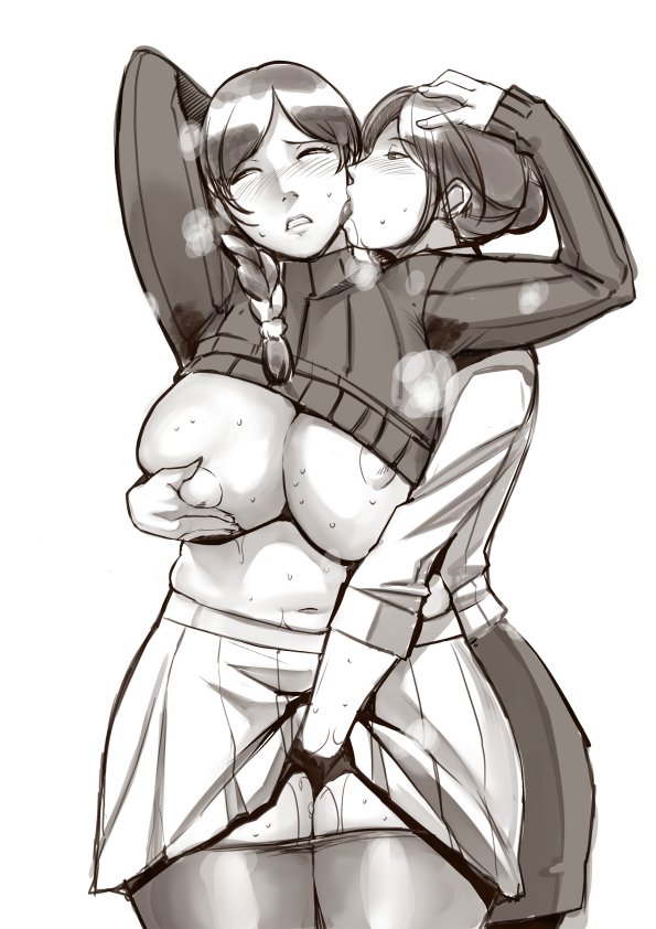 nagare, chris redfield, jill valentine, resident evil, 1boy, 1girl, artist name, black jacket, blue dress, blue eyes, brown hair, dress, gun, handgun, high heels, jacket, jewelry, necklace, simple background, sparkle, star (symbol), star print, weapon, white background