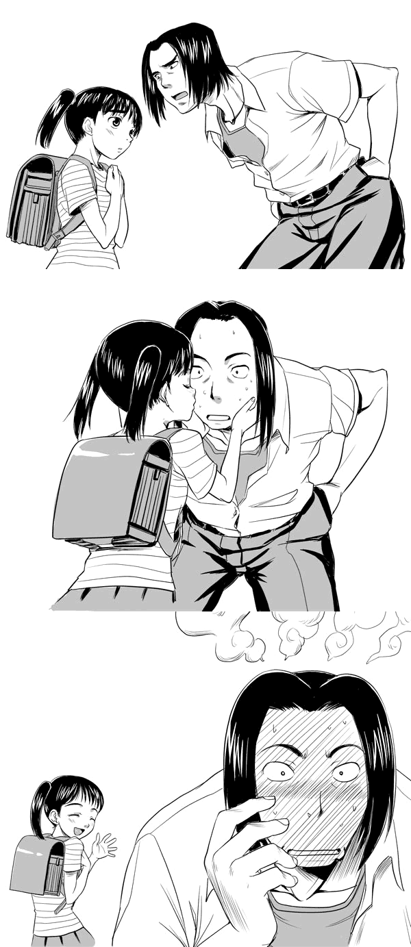 1boy1girl3komabackpackbagblack hairchildcomicgreyscaleheterokissmonochromerandoserusilent comictwintailswaving