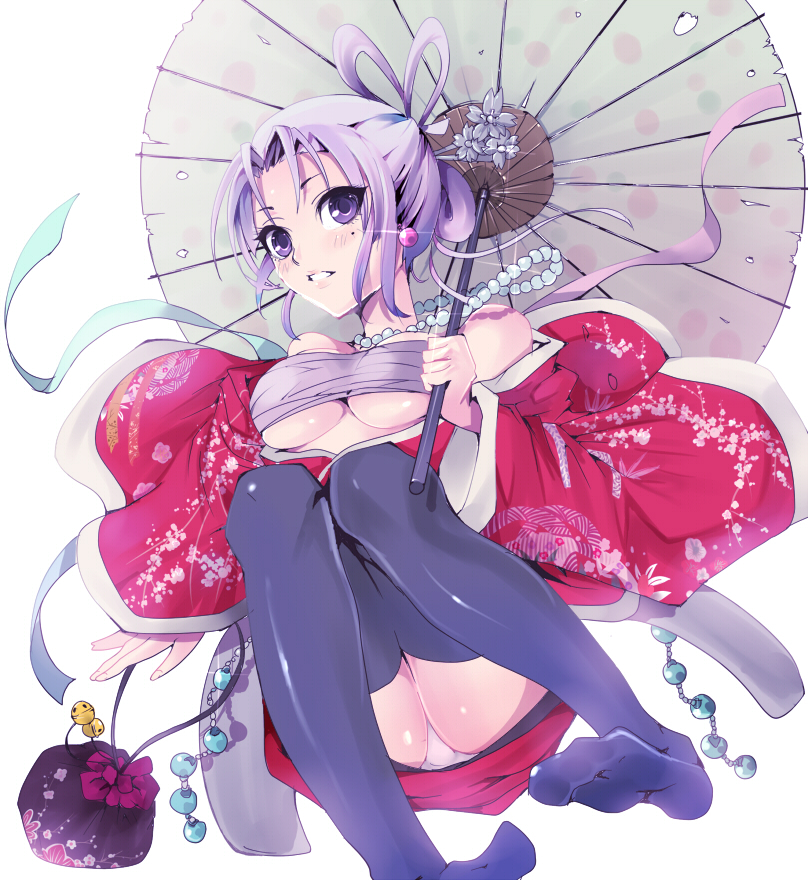 1girlbreastsfeetfemale focusjapanese clotheskimonolarge breastsoil-paper umbrellapantiespantyshotpurple eyespurple hairsarashisolothighhighsumbrellaunderboobunderwear