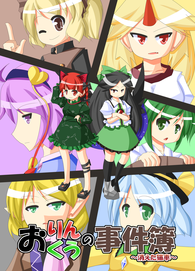 soinjan, arle nadja, carbuncle (puyopuyo), rulue (puyopuyo), satan (puyopuyo), schezo wegey, puyopuyo, puyopuyo quest, commentary, highres, 2boys, 2girls, :o, ;d, arms behind head, blue eyes, blue hair, blue headband, blue pants, blue sandals, blunt bangs, blush, blush stickers, bracelet, brown eyes, brown hair, brown sandals, chibi, chibi only, cloud, copyright name, creature, curtained hair, demon boy, drop shadow, earrings, eyewear on head, eyewear on headwear, fang, floral print, flower, flower necklace, full body, green hair, grey hair, half updo, hands on own cheeks, hands on own face, hat, headband, hibiscus, holding, holding water gun, hoop earrings, horns, instrument, jewelry, lei, multiple boys, multiple girls, necklace, one eye closed, open clothes, open mouth, open shirt, palm tree, pants, parted bangs, pointy ears, purple shirt, red-framed eyewear, red flower, red scrunchie, red shorts, running, sandals, sarong, scrunchie, shirt, short hair, short sleeves, shorts, single blush sticker, smile, star-shaped eyewear, star (symbol), sun, sunglasses, tan, tied shirt, tree, ukulele, undershirt, water gun, white hat, white shirt, white shorts, wrist scrunchie, yellow shirt