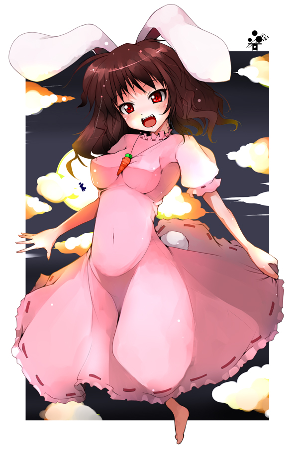 1girlanimal earsbarefootblack hairblushbreastsbrown hairdressfangfemale focuslarge breastsopen mouthpink dressrabbit earsred eyesshort hairsmilesolo