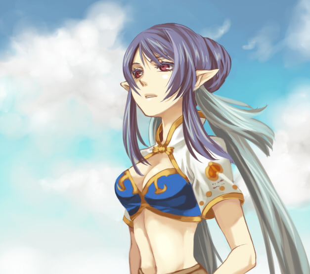 00s1girlblue hairbreastsbustiercleavagedayfemale focuslarge breastslingeriemidriffoutdoorspointy earspurple eyesskysolounderwear