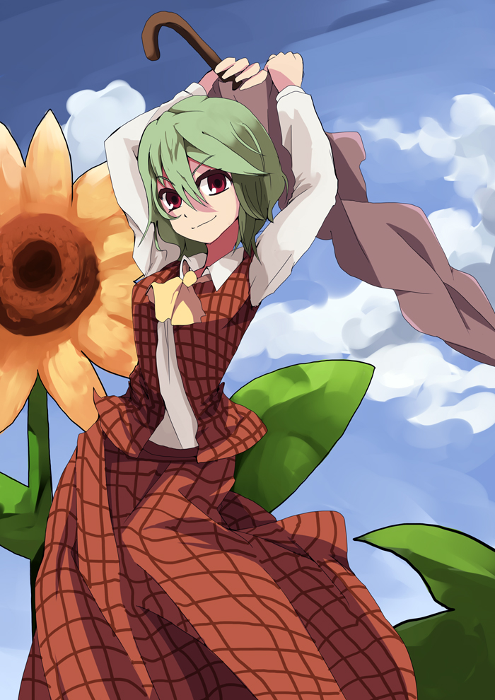 1girlarms upascotclosed umbrellafemale focusflowergreen hairplaid clothesplaid skirtplaid vestred eyesribbonshort hairskirtskirt setsmilesolosunflowerumbrellavest
