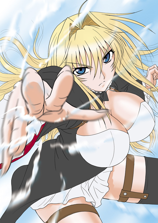 00s1girlblonde hairblue eyesbreastscleavagefemale focushair intakeslong hairsolothigh strapthighhighs