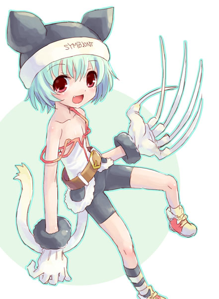 cakepiepizza, dejiko, di gi charat, highres, 1girl, ahoge, animal hat, apron, bell, black outline, blue dress, broom, cat girl, cat hat, cat tail, chibi, chibi only, closed eyes, dress, full body, green hair, hair bell, hair ornament, hat, holding, holding broom, jingle bell, mittens, neck bell, open mouth, outline, parted bangs, shoes, short hair, short sleeves, simple background, smile, solo, tail, white apron, white background, white hat, white mittens, white shoes