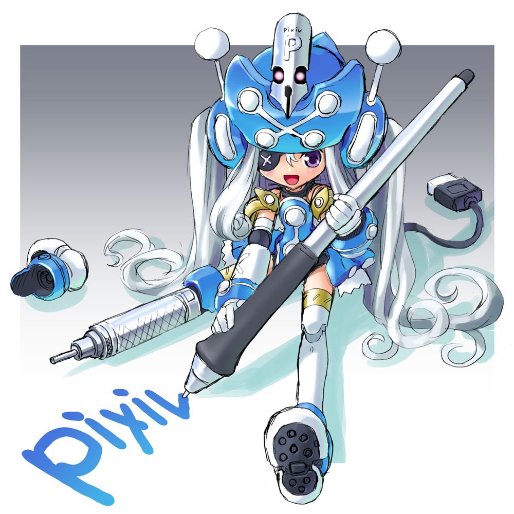 1girlblusheyepatchfemale focusfull bodyhappylong hairmecha musumepenpurple eyessittingsolostylusthighhighstwintailsusb