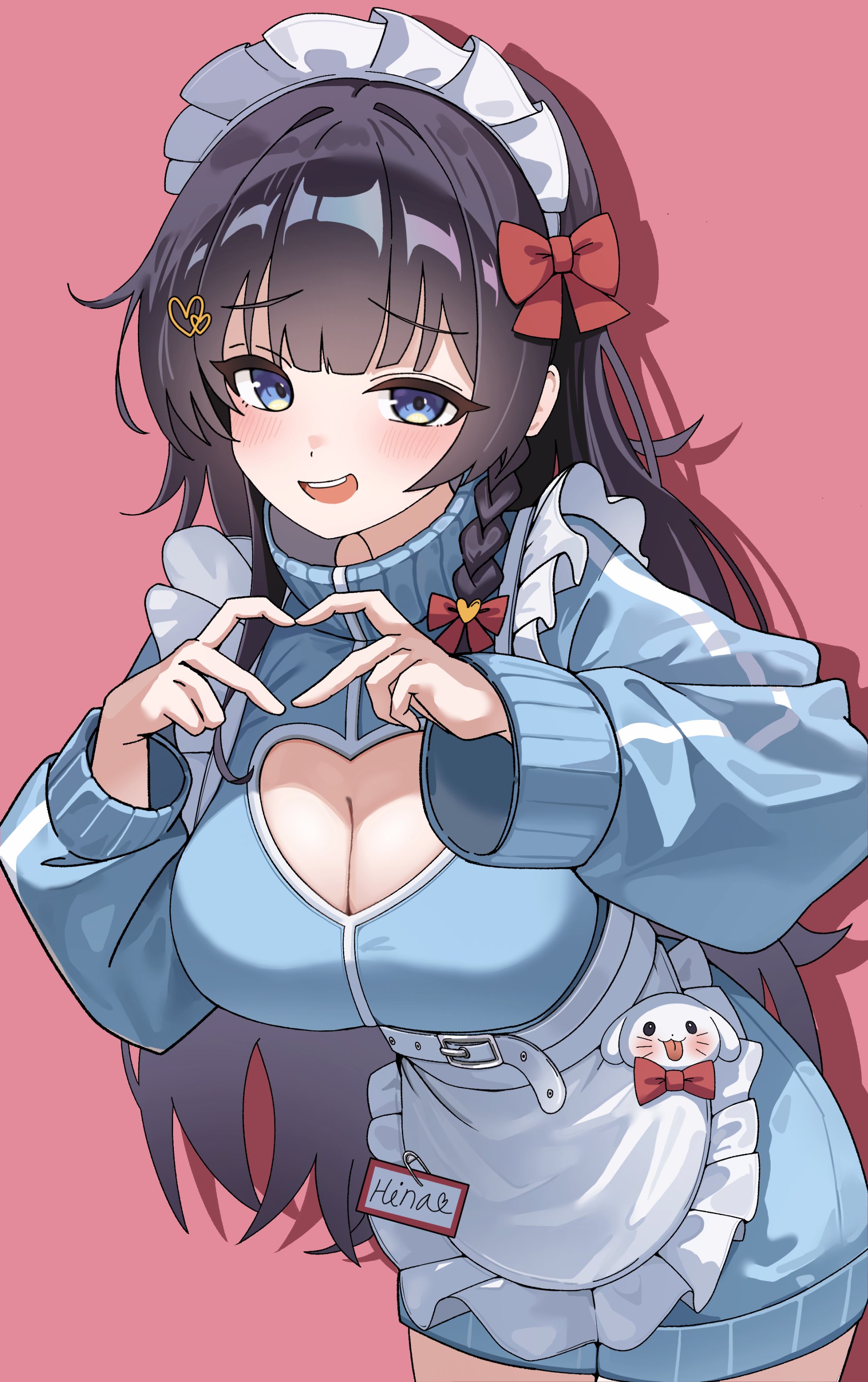 2girlsapronbeltbelt buckleblack hairblue eyesblue romperblushbowbraidbraided sidelockbreastsbucklecharacter charmcharacter namecharm (object)cleavagecleavage cutoutclothing cutoutcowboy shotfrilled apronfrillshaedungi (shirayuki hina)hair bowhair ornamenthands upheartheart cutoutheart hair ornamentheart handslarge breastslong hairlong sleeveslooking at viewermaid headdressmultiple girlsname tagopen mouthpink backgroundraised inner eyebrowsred bowrompershadowsimple backgroundsmilesolostandingstraight hairvery long hairwaist apronwhite apronwhite beltwide sleeves