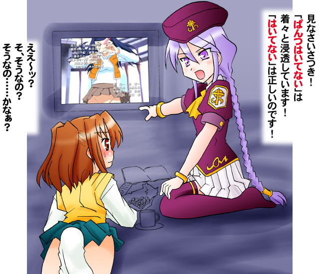 satomi (black scarecrow), asahina mikuru, suzumiya haruhi no yuuutsu, 00s, 1girl, apron, blush, breasts, brown eyes, brown hair, clothes lift, dress, dress lift, female focus, headband, long hair, maid, maid apron, maid headdress, red eyes, simple background, skirt, skirt hold, skirt lift, solo