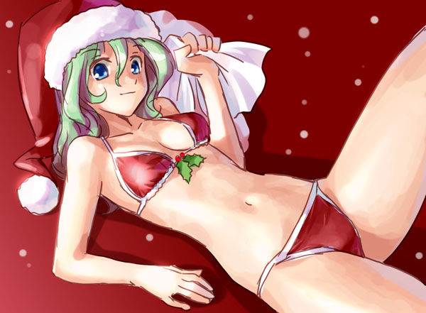1girlbikiniblue eyeschristmascowboy shotfemale focusgreen hairhatlong hairlyingred bikinisanta bikinisanta costumesanta hatsmilesoloswimsuit