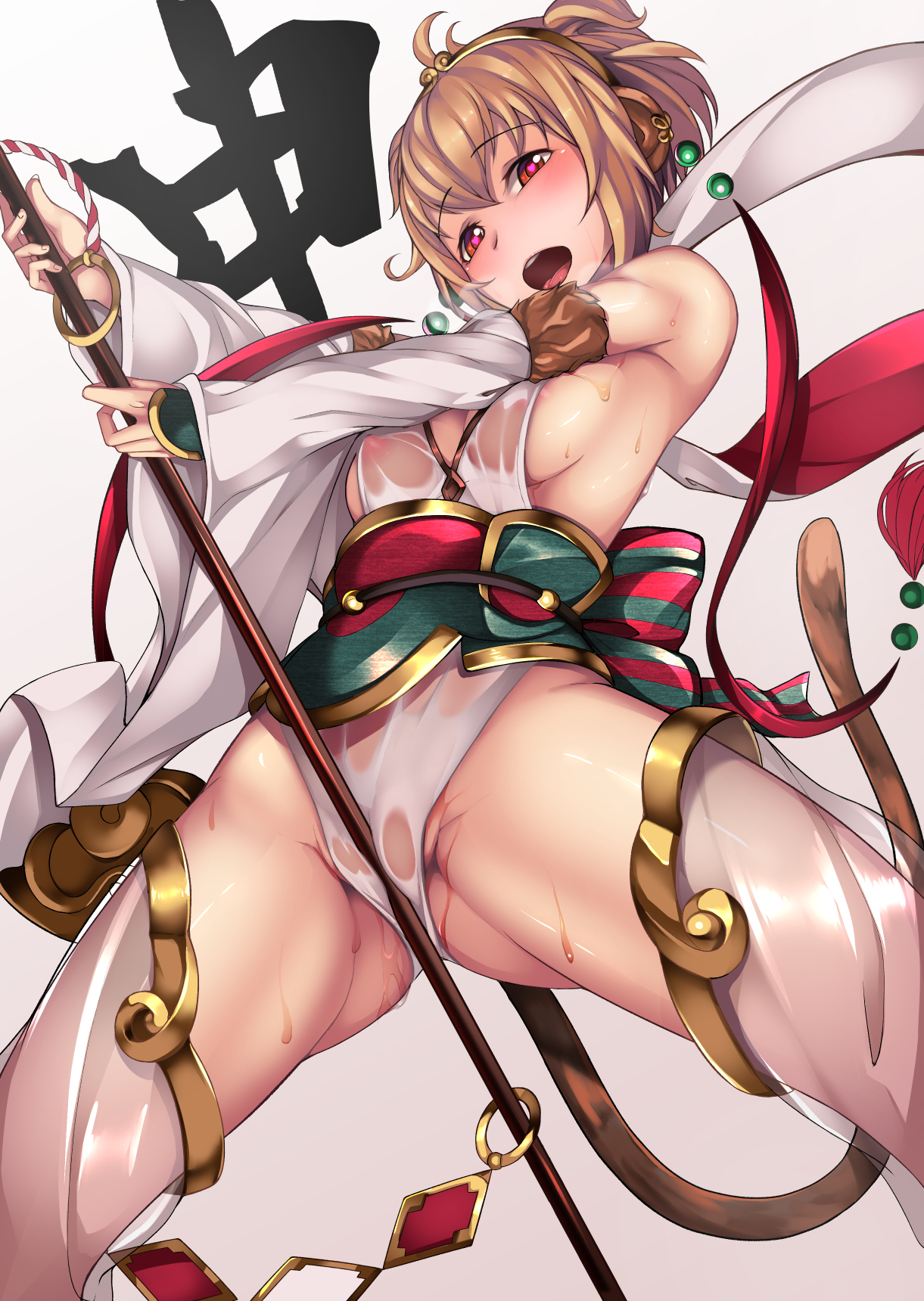 blonde hairbreastsfemaleFlag for Deletionheartheart-shaped pupilslooking at viewermonkey tailnipplesopen mouthpussy juicered eyessee throughshort hairsolostaffsweatsymbol-shaped pupilstail