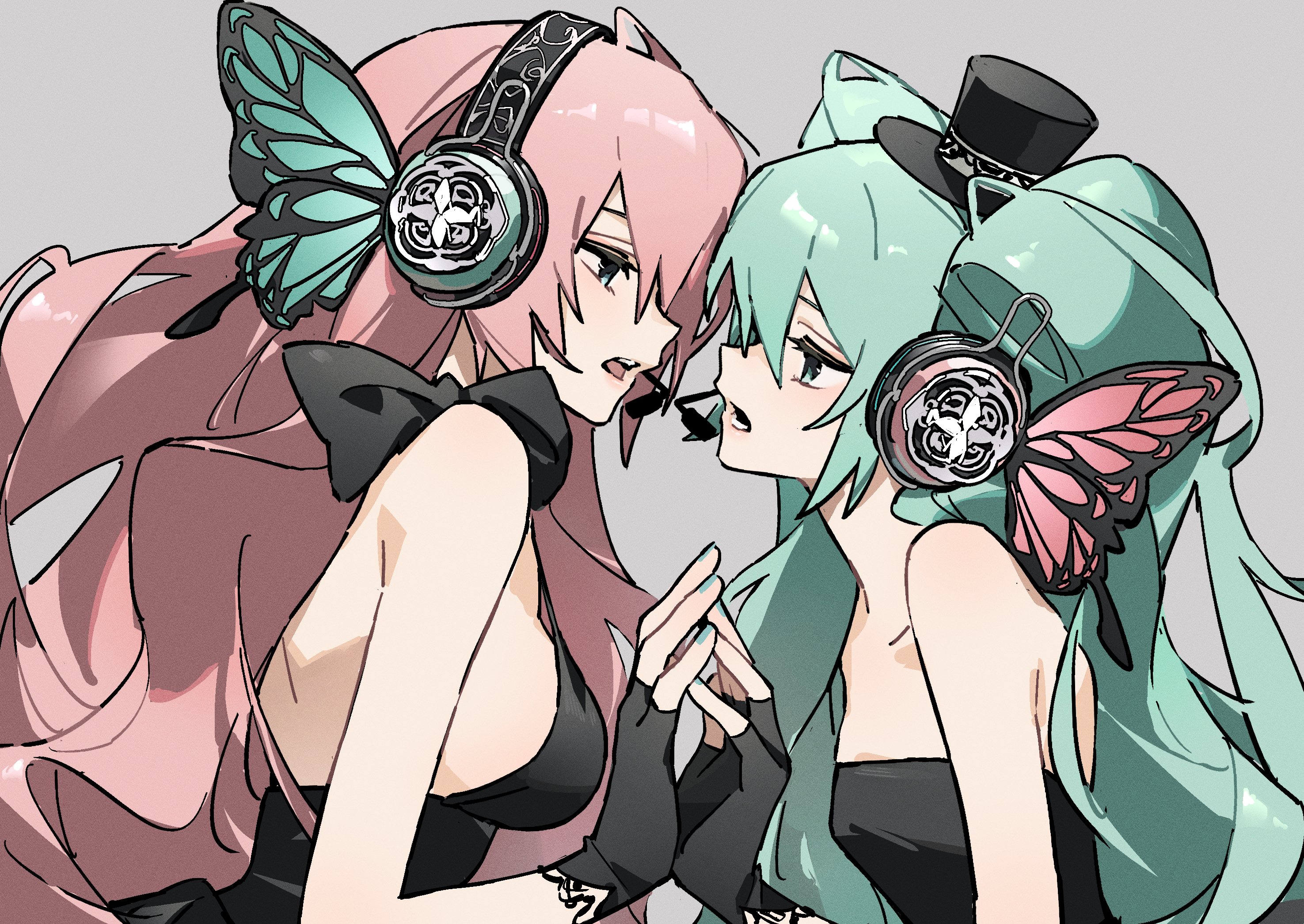 2girlsaqua eyesaqua hairbare shouldersblack dressblack glovesblue eyesblue nailsbreastsbutterfly hair ornamentdresseye contactfingerless glovesfrom sideglovesgrey backgroundgyu9447hair ornamenthatheadphonesheadsetholding handslong hairlooking at anothermedium breastsmini hatmultiple girlsopen mouthpink hairsideboobsimple backgroundupper bodyyuri