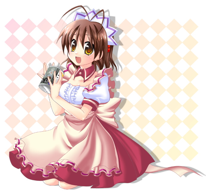 saya (cosplayer), silver hair, photo (medium), 1girl, balloon, bow, cosplay, couch, dress, hair bow, polka dot, red upholstery, ribbon, smile