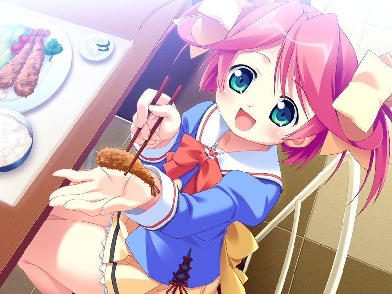 1girlchopstickscrustaceanfeedingfemale focusfoodgreen eyesincoming foodlooking uppink hairpov feedingschool uniformshort hairshrimpshrimp tempurasolotempuratwintails
