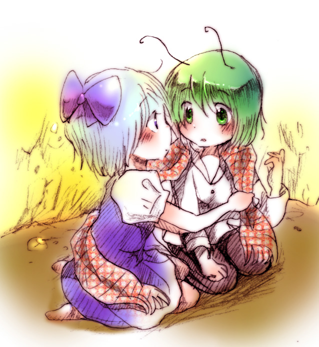 2girlsantennaeblue eyesblue hairblushbowdressfemale focusgreen eyesgreen hairhair bowkneelingmultiple girlsscarfshared clothesshared scarfsitting