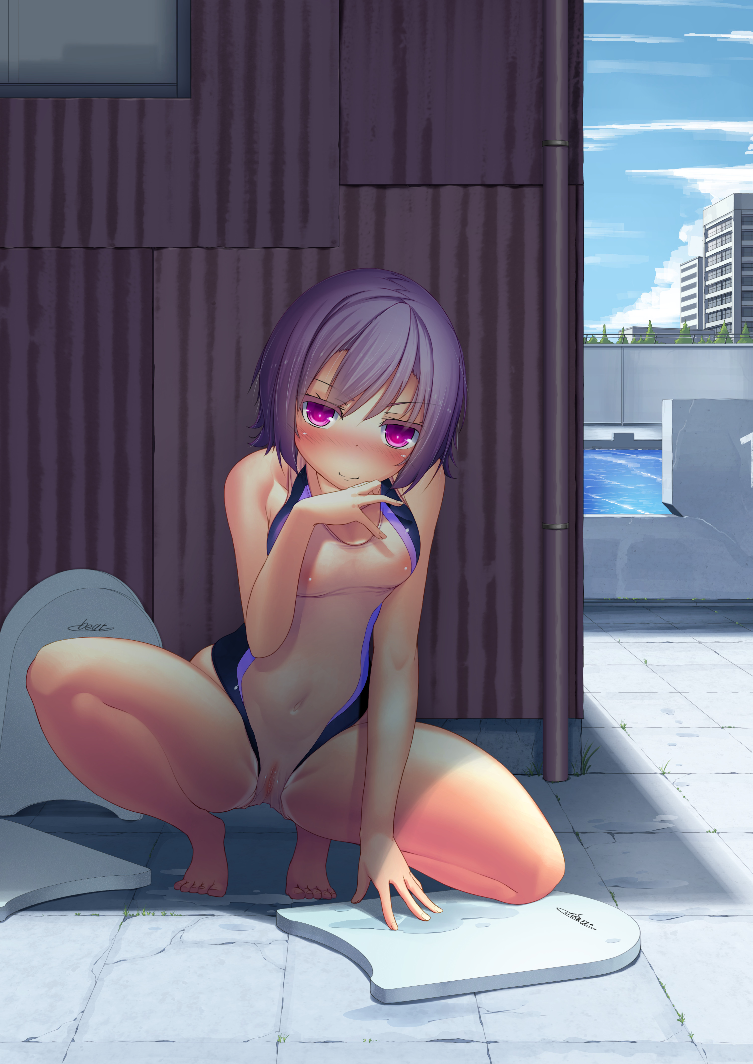 mayo (oekaki bibbi), denji (chainsaw man), reze (chainsaw man), chainsaw man, absurdres, highres, 1boy, 1girl, back-to-back, belt, blonde hair, choker, couple, flower, green eyes, hair bun, hair flower, hair ornament, happy, looking up, pants, purple hair, shirt, shoes, shorts, simple background, single hair bun, sitting, sleeveless, thighhighs, white shirt, zettai ryouiki