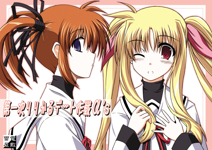 shiranagi, makidera kaede, fate/stay night, fate (series), 00s, 2girls, black hair, blush, bow, brown eyes, choker, dress, frown, green hair, looking at viewer, multiple girls, peeking, pillar, ribbon, short hair, sleeveless, sleeveless dress, upper body, white dress, yellow eyes, yuri