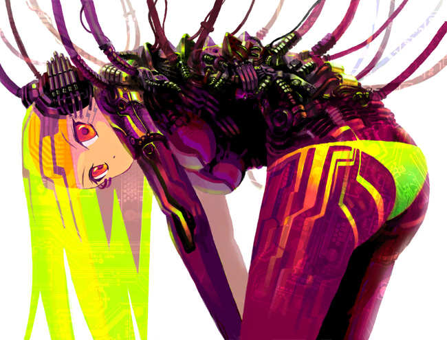 1girlandroidassbent overcablecovered mouthcowboy shotcyborgfemale focusgreen hairpantiesred eyesscience fictionsimple backgroundsolounderwearunderwear onlywhite background