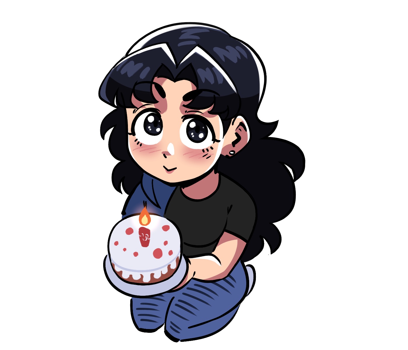 1girlbirthdaybirthday cakeblack hairblack shirtcakecandlefoodhappy birthdayholdingholding cakeholding foodshirtsmile