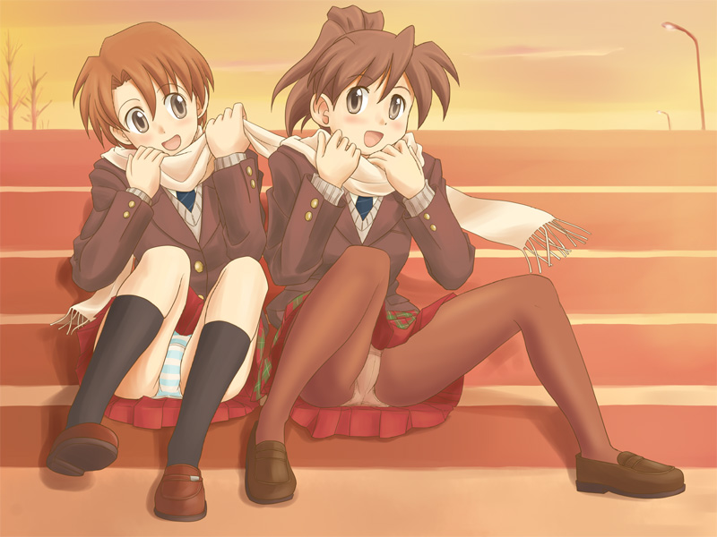 morimoto kiyona, shichigusa nanako, nanako kaitai shinsho, highres, 1990s (style), 1girl, blue thighhighs, breasts, brown hair, choker, double bun, fang, female focus, garter straps, hair bun, large breasts, maid, panties, red eyes, retro artstyle, solo, striped clothes, striped panties, tears, thighhighs, unaligned breasts, underwear