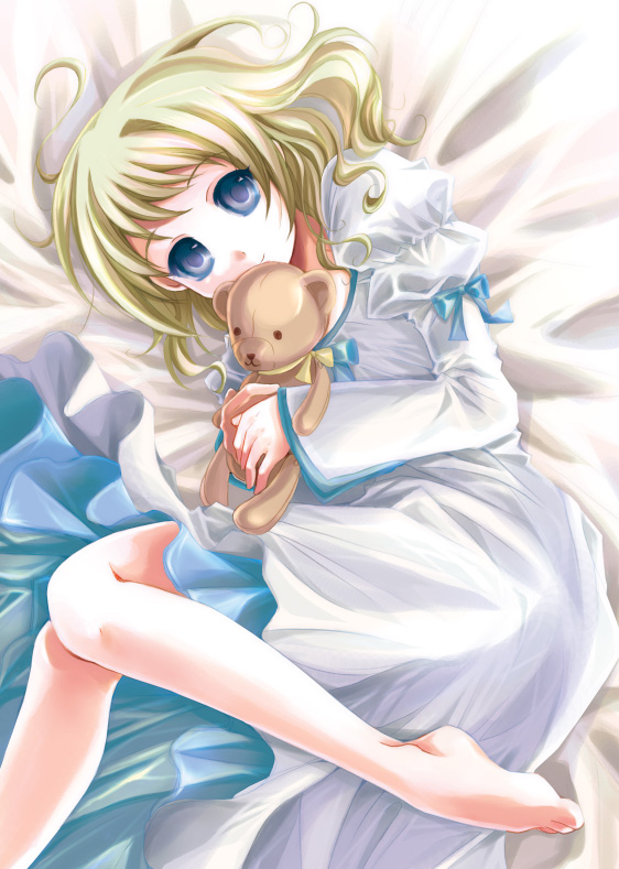 00s1girlbarefootbedblonde hairblue eyesfeetfemale focussolostuffed animalstuffed toyteddy bear