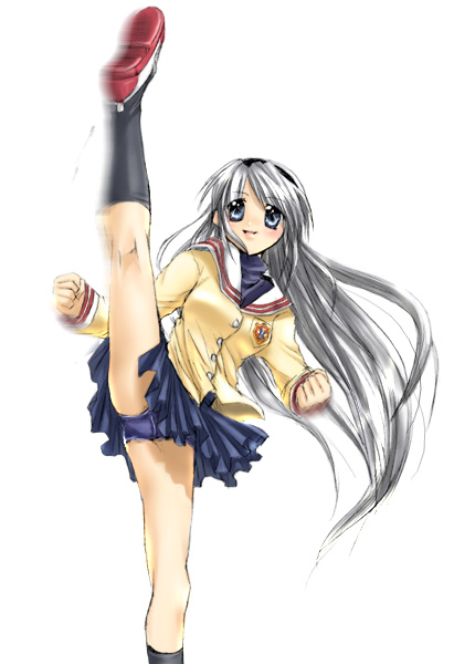 00s1girlblue eyesbreastsfemale focushigh kickkickinglong hairpantiesschool uniformshoessockssolosplitstandingstanding on one legstanding splitunderwearwhite background