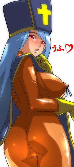 cinque (nanoha), numbers (nanoha), lyrical nanoha, mahou shoujo lyrical nanoha, mahou shoujo lyrical nanoha strikers, lowres, 00s, 1girl, black gloves, breasts, close-up, eyepatch, female focus, gloves, hands on own chest, looking at viewer, smile, solo, text focus, upper body, yellow eyes