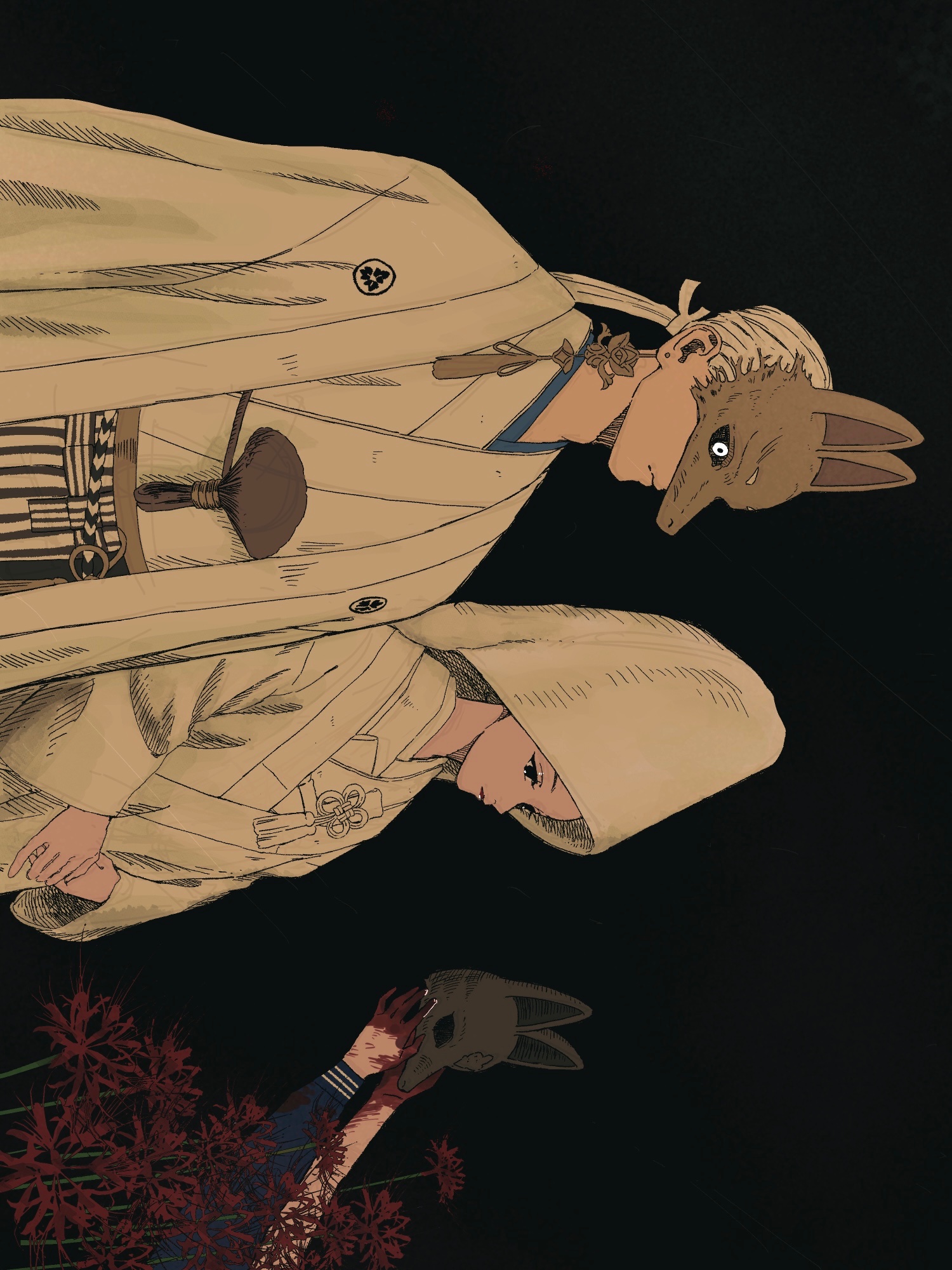 black scleracolored scleraearringsflowerfox maskhands upjapanese clothesjewelrykimonomaskrobespider lilytasseltassel earringswhite kimonowhite robe