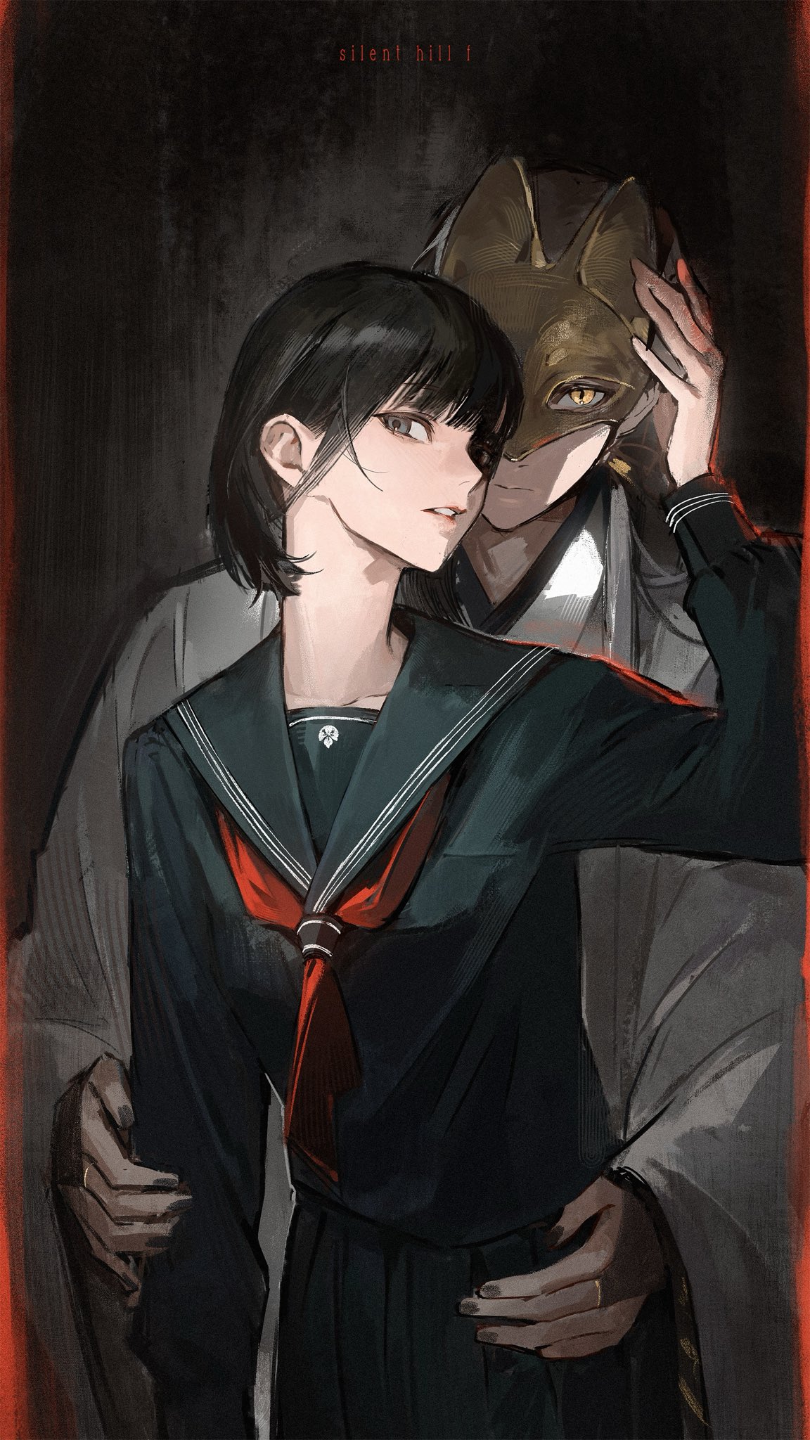 1boy1girlblack sailor collarblack serafukuearringsfox maskjapanese clothesjewelrymaskneckerchiefred neckerchiefrobesailor collarschool uniformserafukutasseltassel earringswhite robe