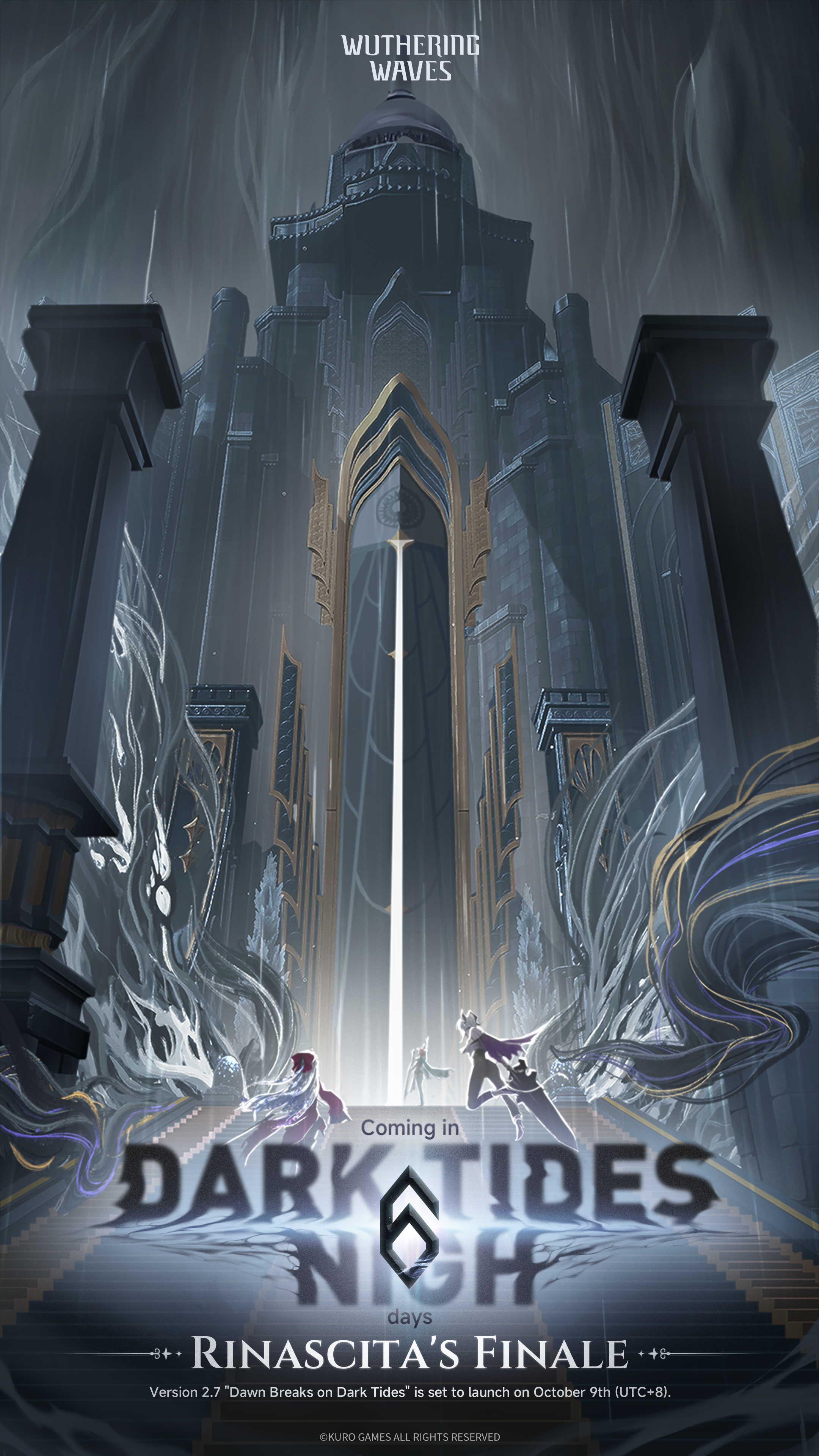 addendium, ninomae ina'nis, hololive, hololive english, highres, 1girl, black dress, black veil, dress, fang, gradient hair, hand fan, hat, looking at viewer, mob cap, multicolored hair, pointy ears, purple eyes, purple hair, skin fang, solo, tentacle hair, veil, virtual youtuber