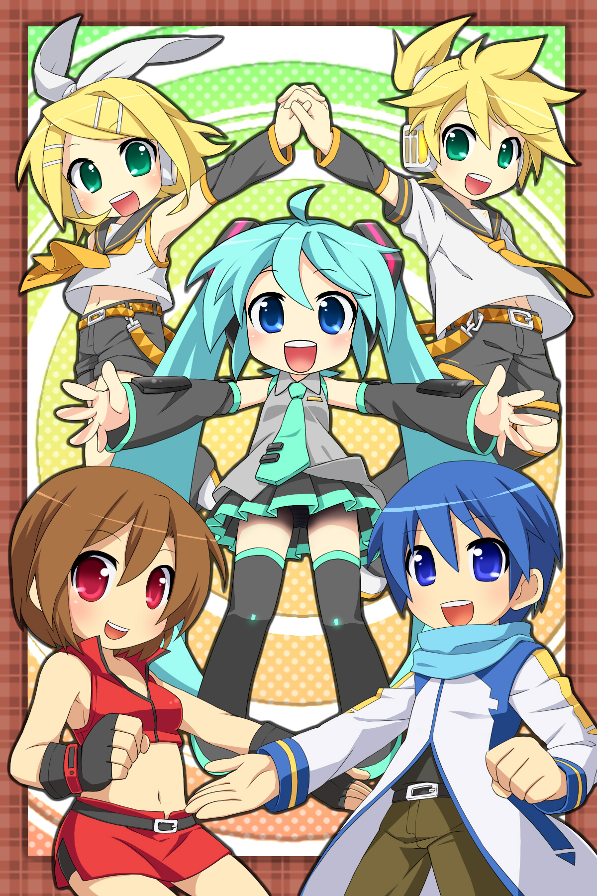 2boys3girlsblue scarfdetached sleevesfingerless glovesglovesmidriffmultiple boysmultiple girlsscarfskirtthighhighstwintails