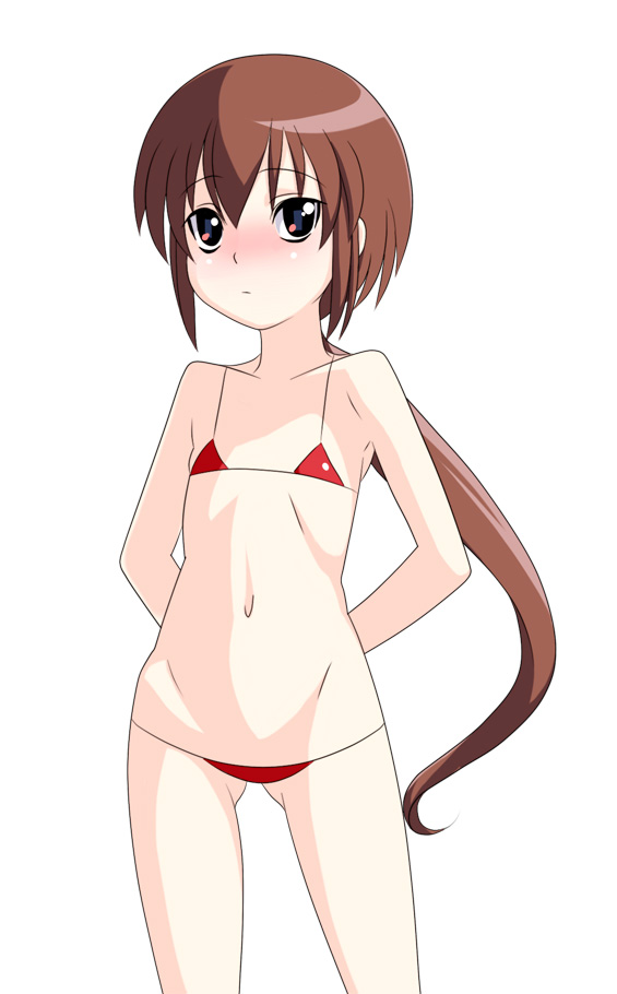 arms behind backbikiniblushbrown hairflat chestlolilong hairlowleglowleg bikinimicro bikiniponytailred bikinisoloswimsuit