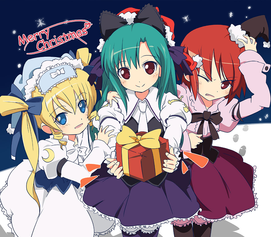00sblonde hairblue eyesblushbrown eyeschristmasdressgiftgreen hairhair ribbonhatholdingholding giftpantyhosered hairribbonsanta hatsmilesnow