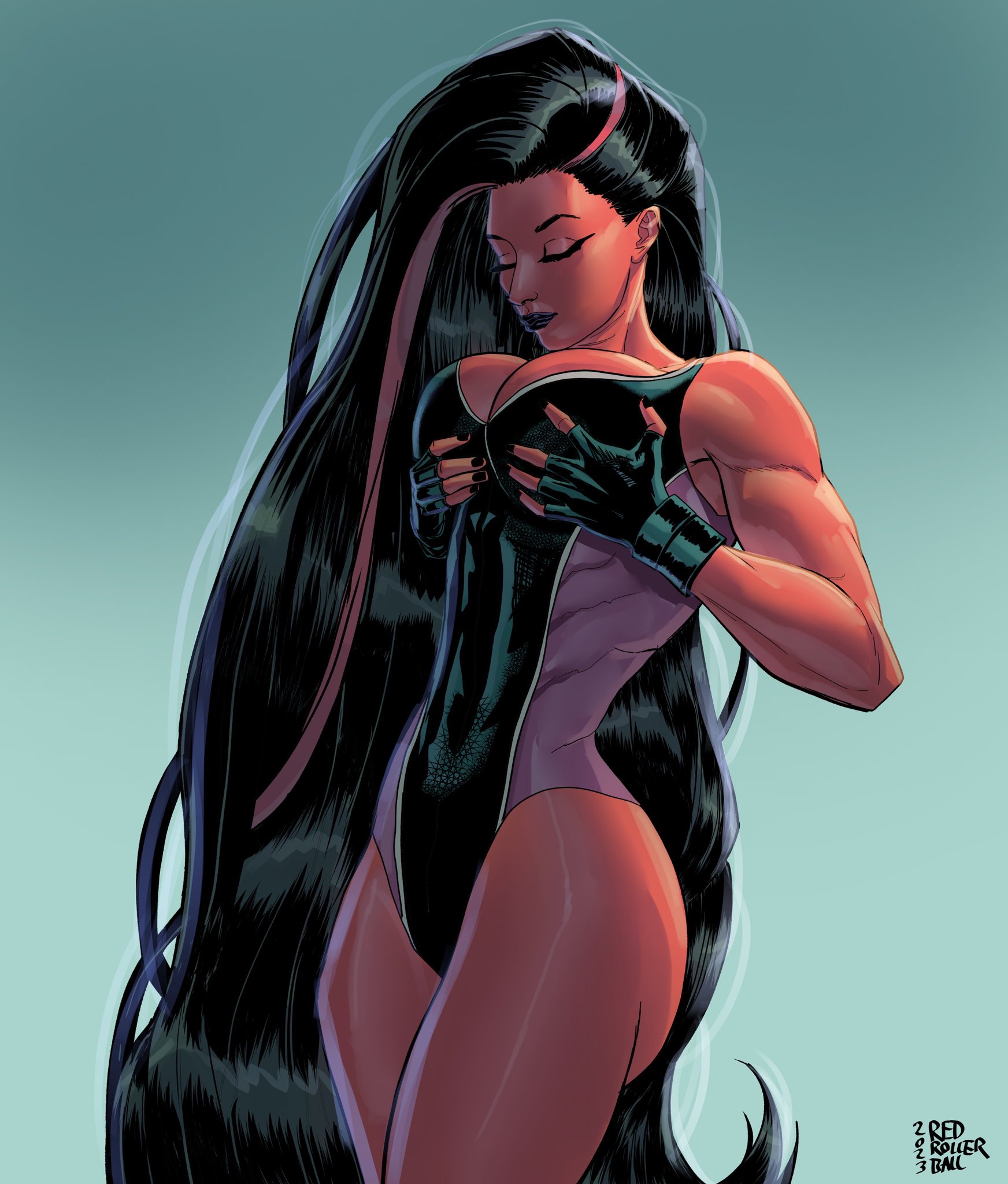 1girlaqua backgroundartist nameblack glovesblack hairblack leotardblack lipsbreastsclosed eyescolored skindatedfingerless glovesglovesgrabbing own breastgradient backgroundleotardlipsticklong hairmakeupmulticolored hairmulticolored leotardmuscularmuscular femalepink leotardred skinsolostreaked hairtwo-tone leotard