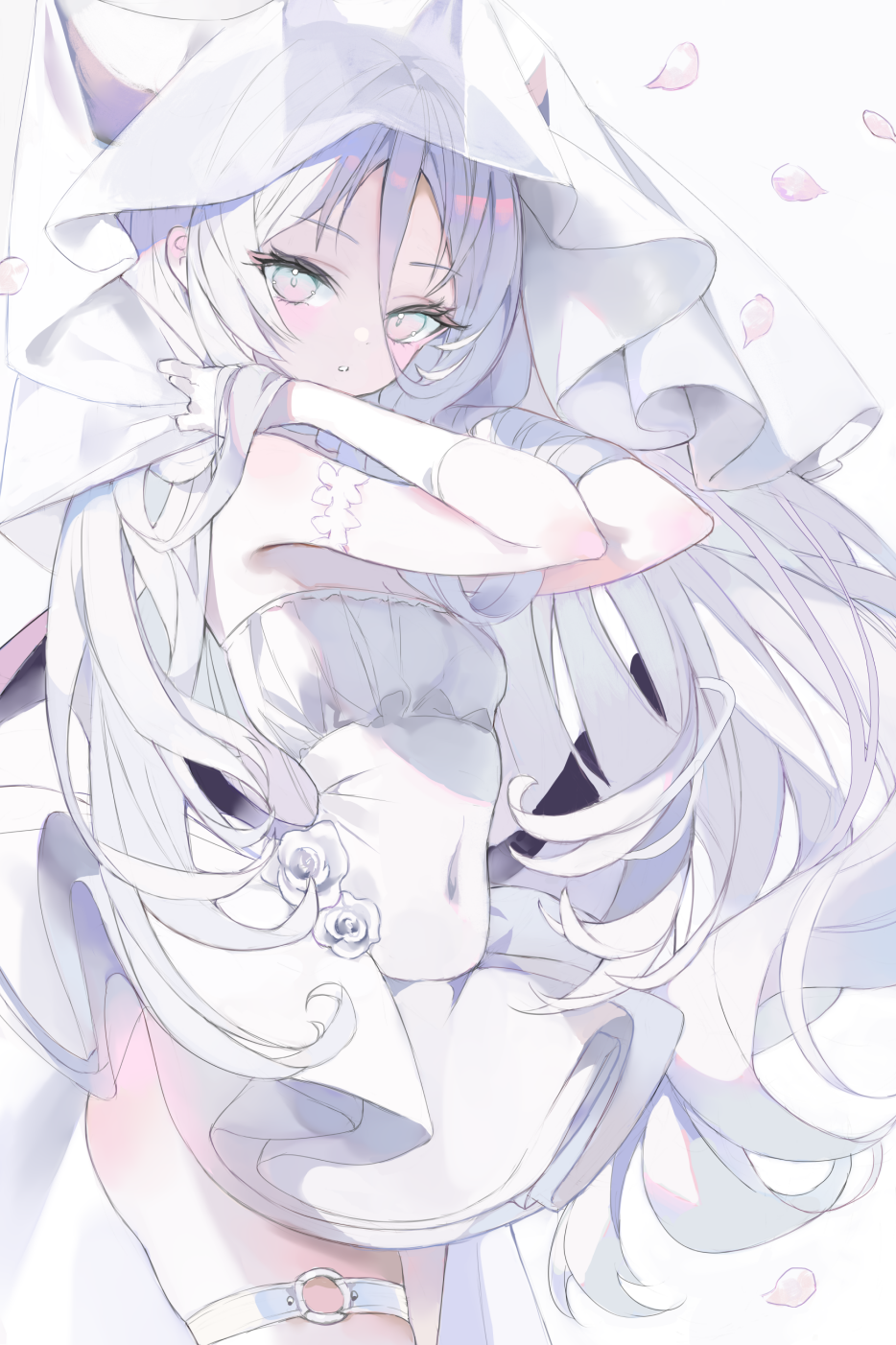 1girlblushbreastsdemon girldemon hornsdemon wingsdressgloveshornslong hairlooking at viewerlow wingsmarant38small breastssolostandingvery long hairwedding dresswhite gloveswhite hairwings