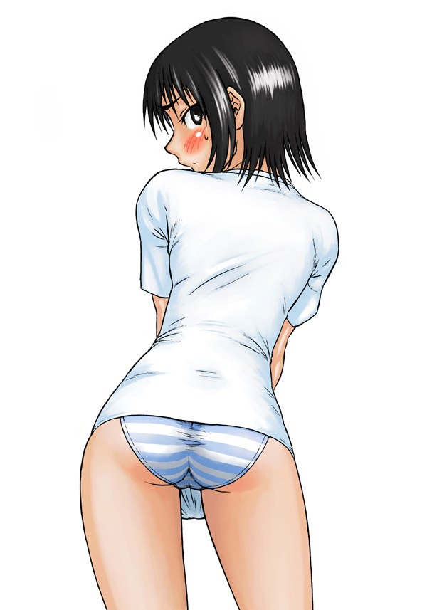 00s1girlassblack eyesblack hairblushcameltoefemale focusfrom behindlooking at viewerlooking backpantiesshirt tugshort hairsolostriped clothesstriped pantiessweatdropunderwear