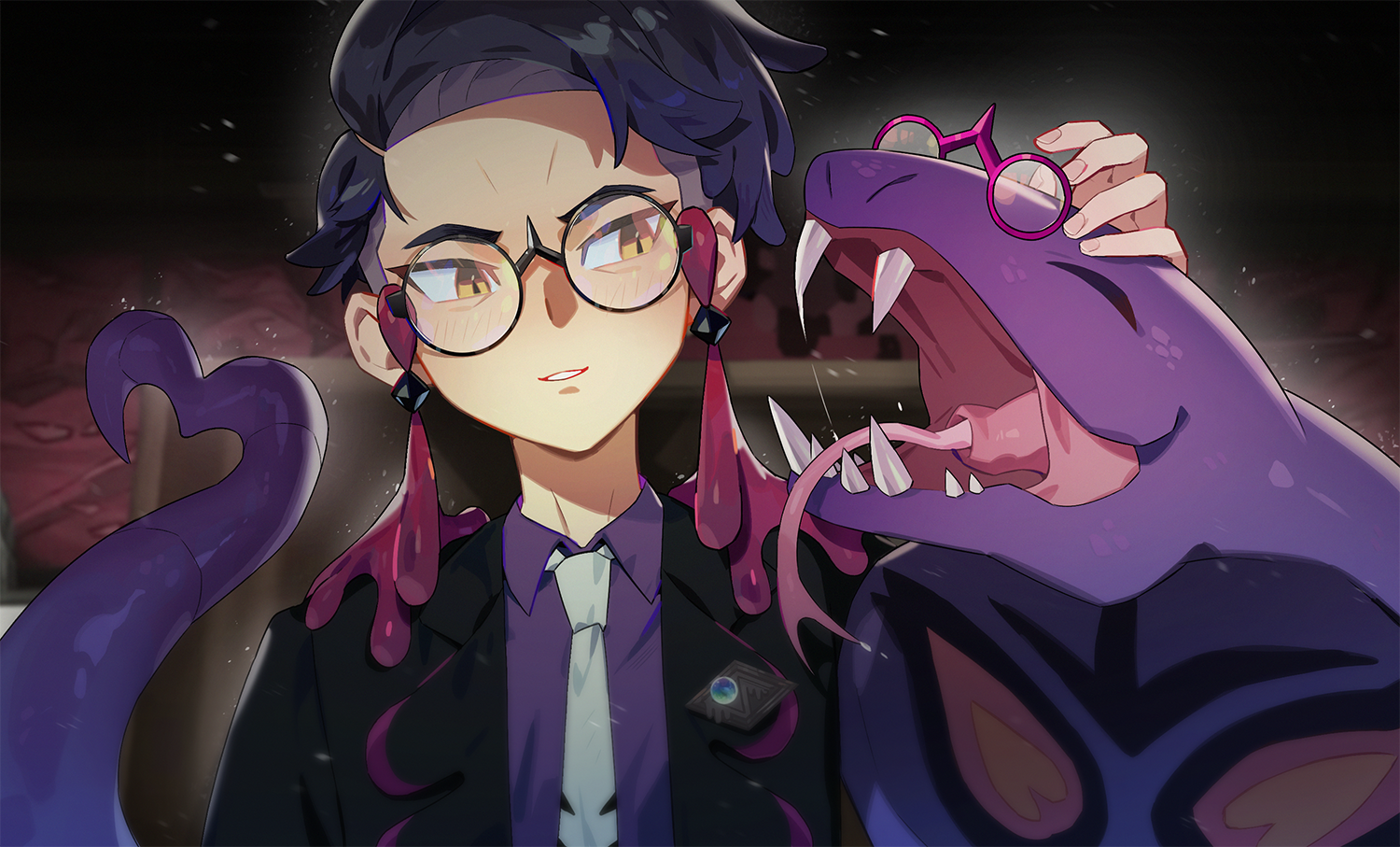 1boyblack hairblack jacketblack-framed eyewearcollared shirtdated commentarygen 1 pokemonglasseshand upheartheart tailjacketmale focusnecktiepokemon (creature)round eyewearshirtshort hairtailyellow eyes