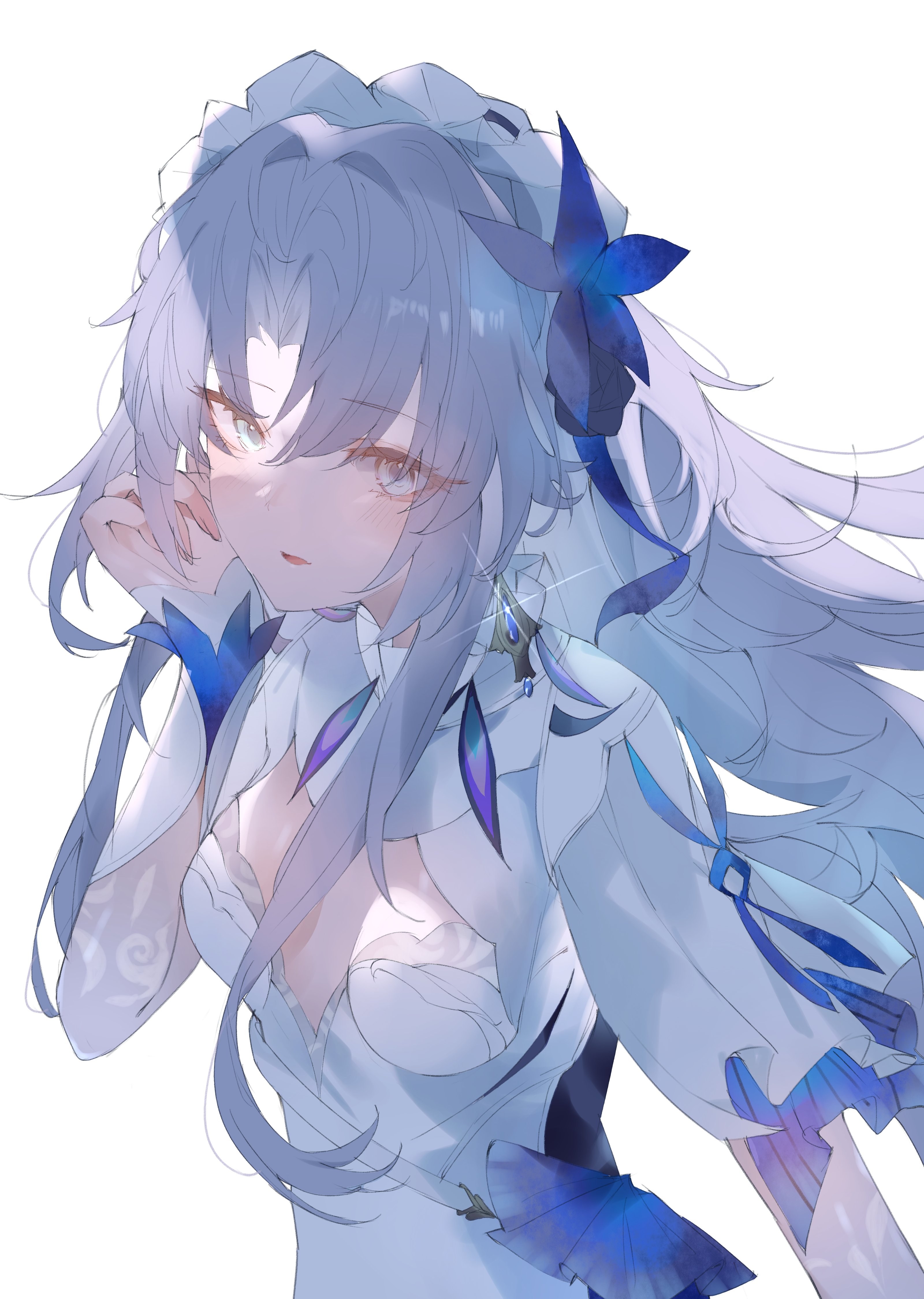 1girlaqua eyesblue flowerbreastscantarella (wuthering waves) (cosplay)cosplaydressearringsfingernailsflowerhair flowerhair ornamenthand upheaddressjewelrylong hairlooking at viewerparted bangsparted lipspurple hairshrug (clothing)simple backgroundsmall breastssoloupper bodywhite backgroundwhite dresswhite shrug