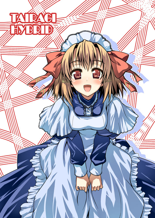 :d1girlblue dressblushdressfemale focusleaning forwardlong sleeveslooking at viewermaidmaid headdressopen mouthshort hairsmilesolostandingtareme